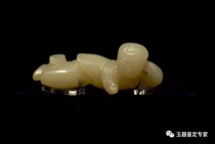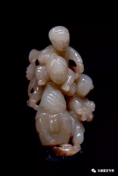 合像高9.2厘米,主体为女童,一稍大男童随左,另一幼童骑于女童肩上,似为姐弟。合像设计巧妙,造型逼真,作品写实,是目前所见传世实物中艺术性最强、刻工艺最精致的一件明代早期遗物。从服饰看,这种肚带、围裙和灯笼裤式是苏松地区民间通常装束,由此推论该器为当地玉工所作之品。