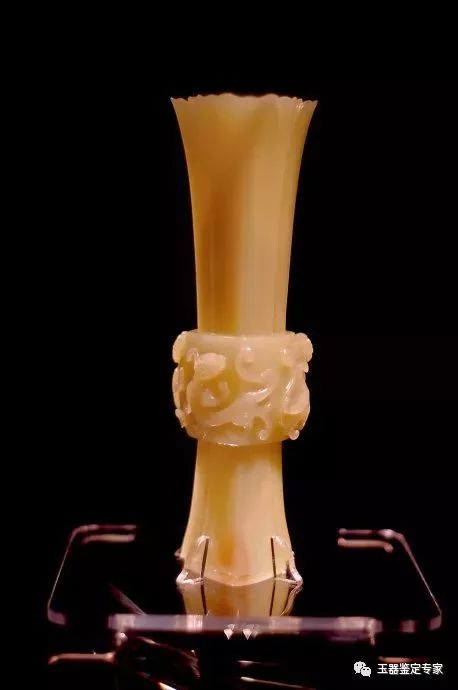 这件玉觚为黄玉质,形制仿商周青铜彝器。器身上下部雕葵瓣纹,中部浮雕三条蟠螭,底足内刻“乾隆年制”四字篆书款,可知这是清代乾隆年间的宫廷用品。玉质纯洁无暇,琢工高超。