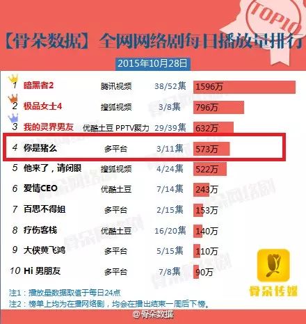2015年10月28日网络剧播放量表现:《你是猪么》日播573万位列日播榜第四位!