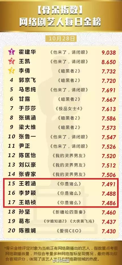 同样,在骨朵网络剧公布的2015年10月28日网络剧及艺人指数表现中,《你是猪么》三大主演王若涵、李梦颖、王皓祯首次同登艺人金榜!