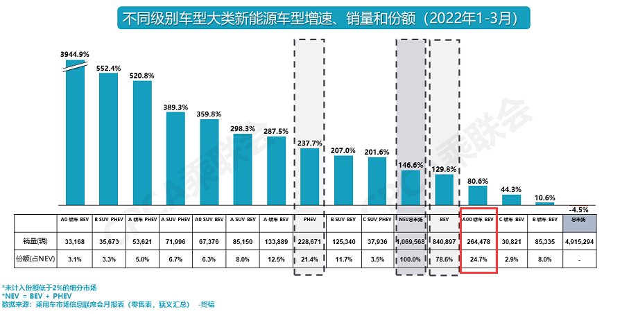 从乘联会统计的数据来看,新能源车走量,主要是微型纯电动车畅销,A00级车型的批发量是11.9万辆,比其它级别车型更高。而销量方面,A00级轿车超26万辆,市场份额达到24.7%,同样是远远超过其它级别新能源车车型。可见,在新能源车市场销量中,微型纯电动车是核心主力。