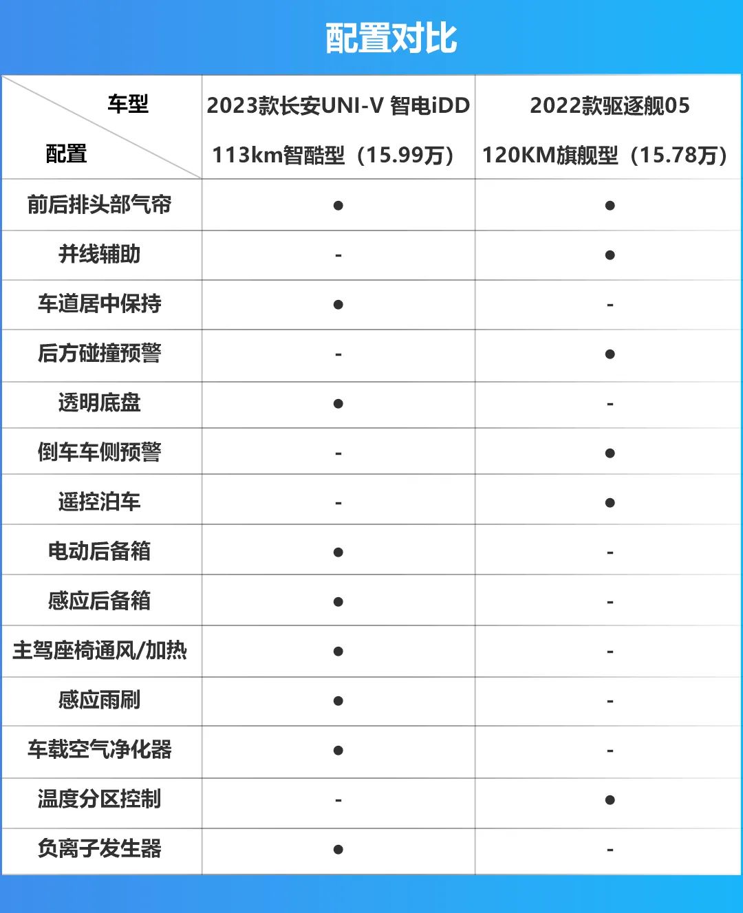长安UNI-V 智电iDD目前推出了两款车型,分别是14.49万元的智趣型和15.99万元的智酷型。买车君选取15.99万元的智酷型与驱逐舰05的120km旗舰型进行对比。可以发现,在价格相近的情况下,长安UNI-V 智电iDD的配置会更丰富一些,比如多出了主驾座椅通风、加热功能。