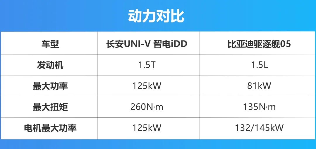 动力方面,长安UNI-V 智电iDD搭载了一套1.5T插混系统,可实现6.5秒破百,而搭载了1.5L插混系统的驱逐舰05最快是7.3秒,略逊长安UNI-V 智电iDD一筹。不过,驱逐舰05在油耗方面表现得更加出色。