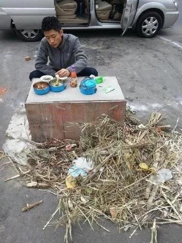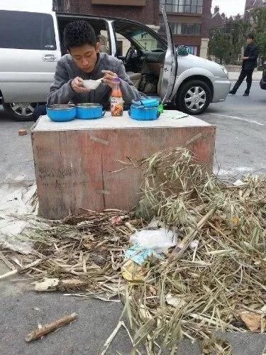 片场吃饭不端架子,哪里开饭都可以,垃圾堆旁边吃的那么欢快。