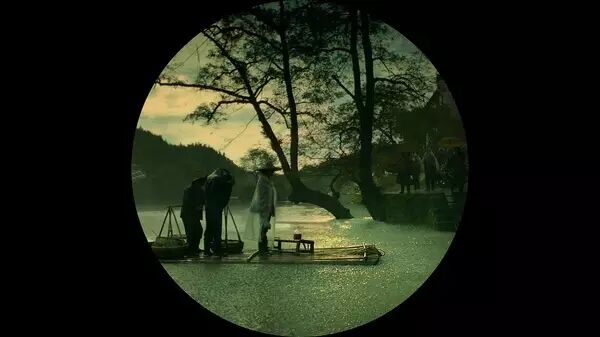 影片开始,李雪莲在水中乘着竹筏,在圆幅的衬托下既表现出了南方水乡的清幽,又能展现普通百姓平静的生活。