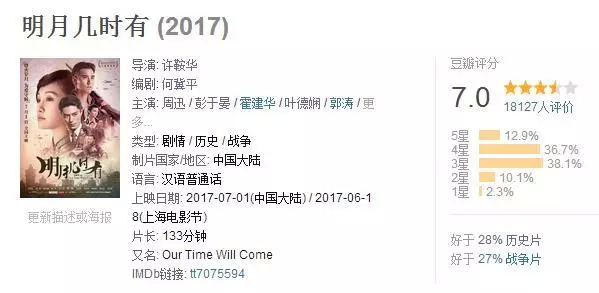 影片的豆瓣评分从6.7缓慢爬升到7.0,算不上是一部烂片。但是和同类型影片比起来,仅好于28%的历史片、27%的战争片,大海觉得还是挺失望的。