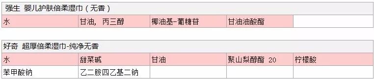 上面2个表格分别列出了强生和好奇的婴儿湿巾成分。
