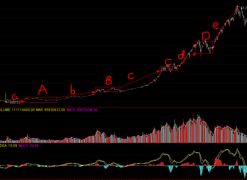 回顾2005年到2007年的大牛市,998点到6124点,整个6倍的上涨,中间用了4个30分钟中枢连接,我们可以看出来,d段的走势与e段在力度上与空间上并没有形成背驰。面对如此凌厉的上涨,我们怎么解决心中的魔障,达到狂热的终点。