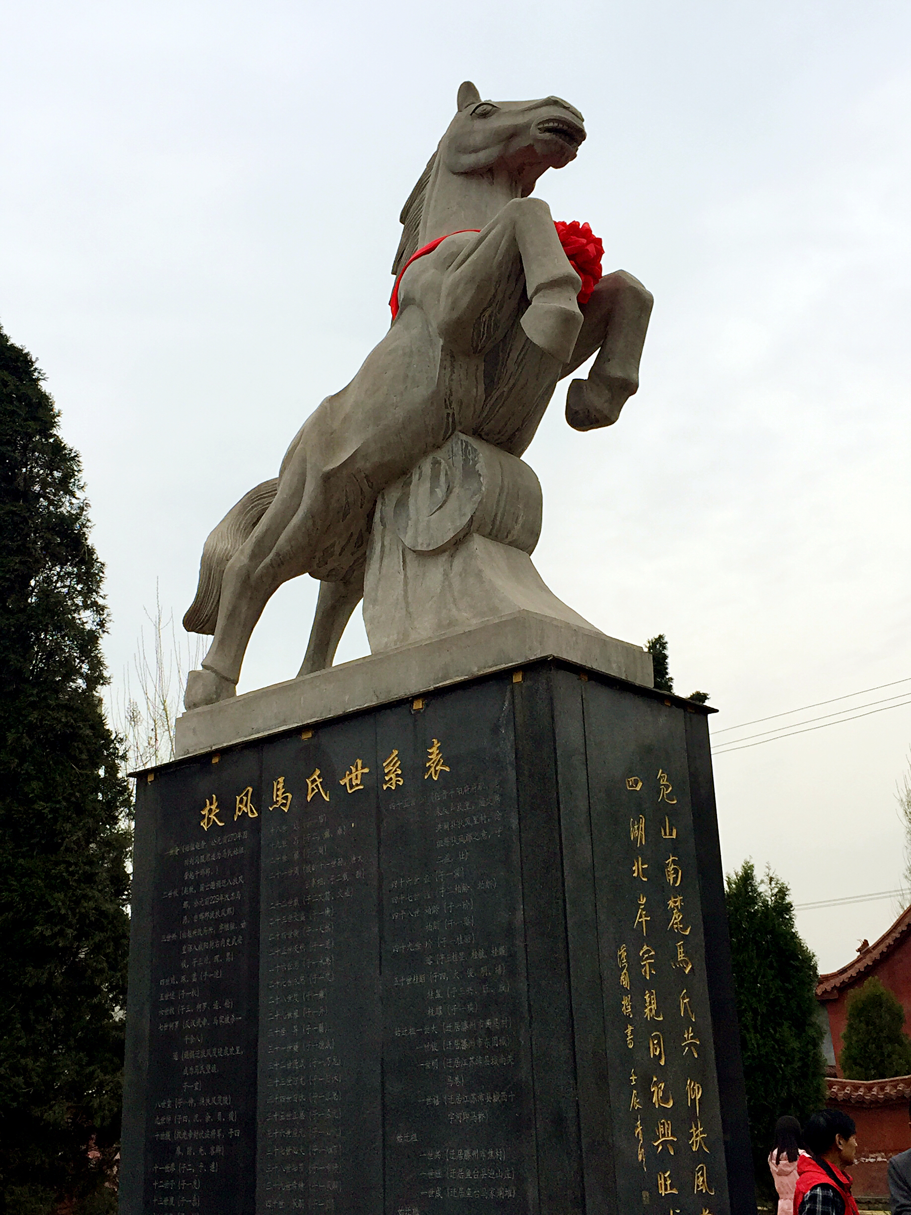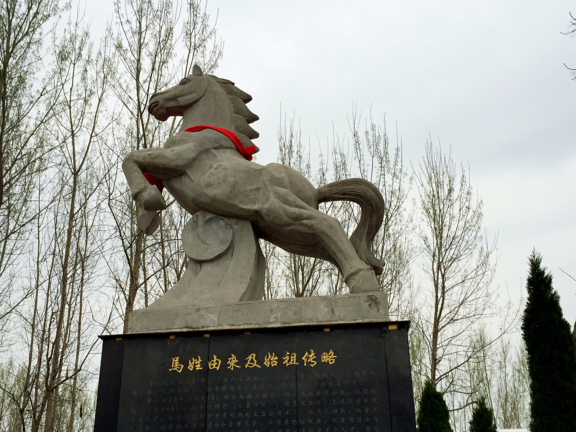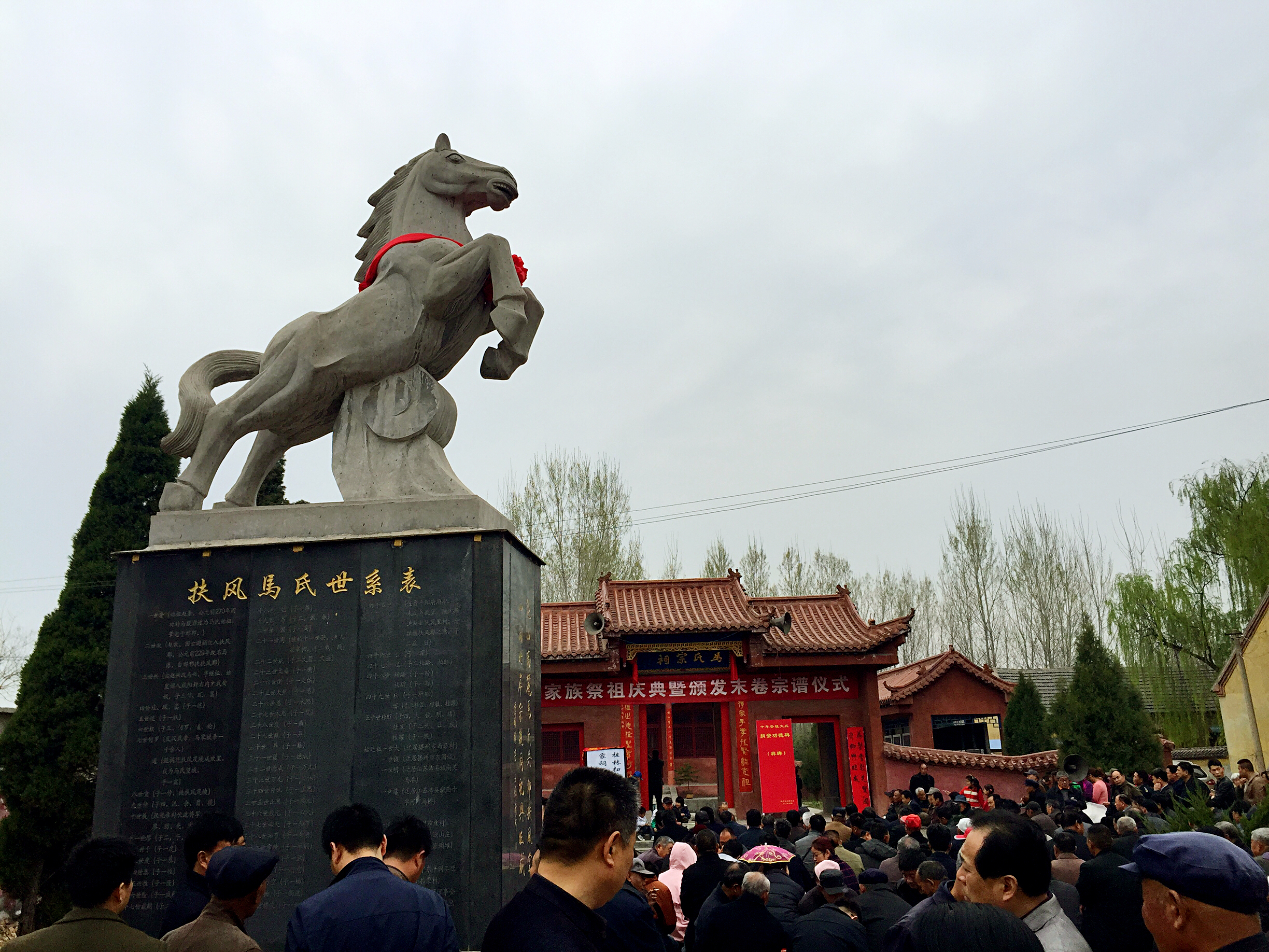 马姓起源于战国时期赵国的国姓赵。赵武灵王之子赵奢公,居于赵国都城邯郸,因其战功卓著,而被赵惠文王封为马服君,卒后葬于紫山。从其孙赵兴开始,改赵氏为马服氏,后单姓马。因而,邯郸为我汉族马氏之发源地。到了东汉,马氏家族依旧显赫。马援将军一生南征北战,后来落户陕西茂陵县。他有个儿子叫马拔,字扶风,因马家功绩很大,当地一个村子被命名为扶风毕公村,这里也被视为马氏的发祥之地。故马氏后人,均以扶风作为郡望和堂号。