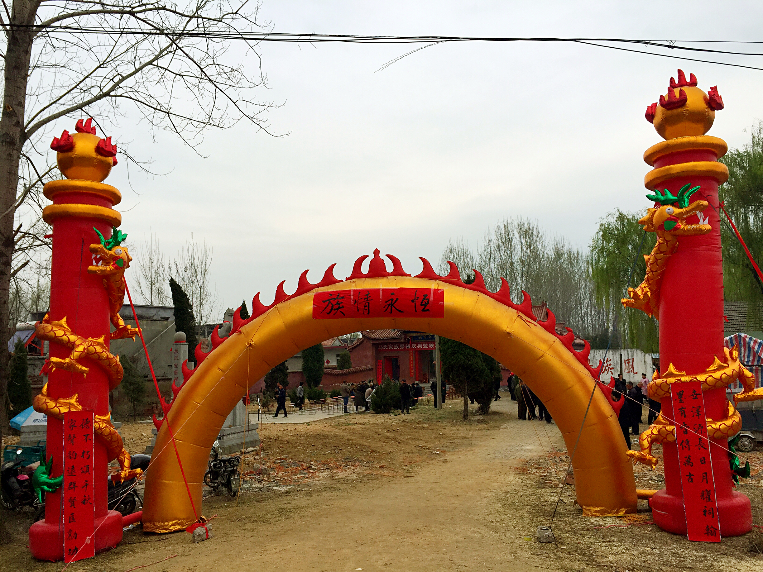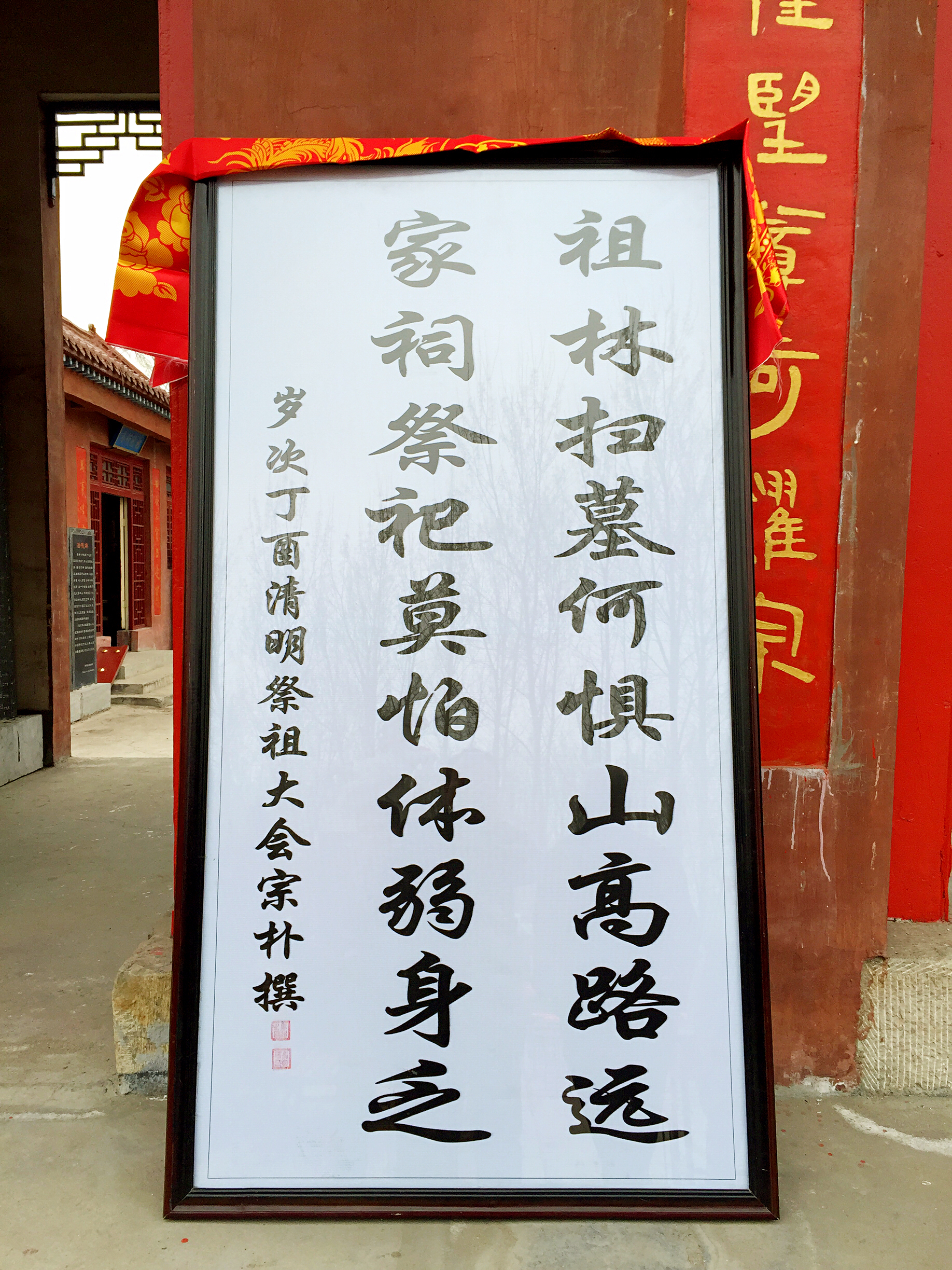 一早赶到会场,老远便看到了高大的彩虹门及宫灯柱,上有族人撰写的对联“世泽源长,日月耀祠,翰墨有香传万古;家声韵远,群贤匡勷,功德不朽颂千秋”,横批是“族情永恒”。