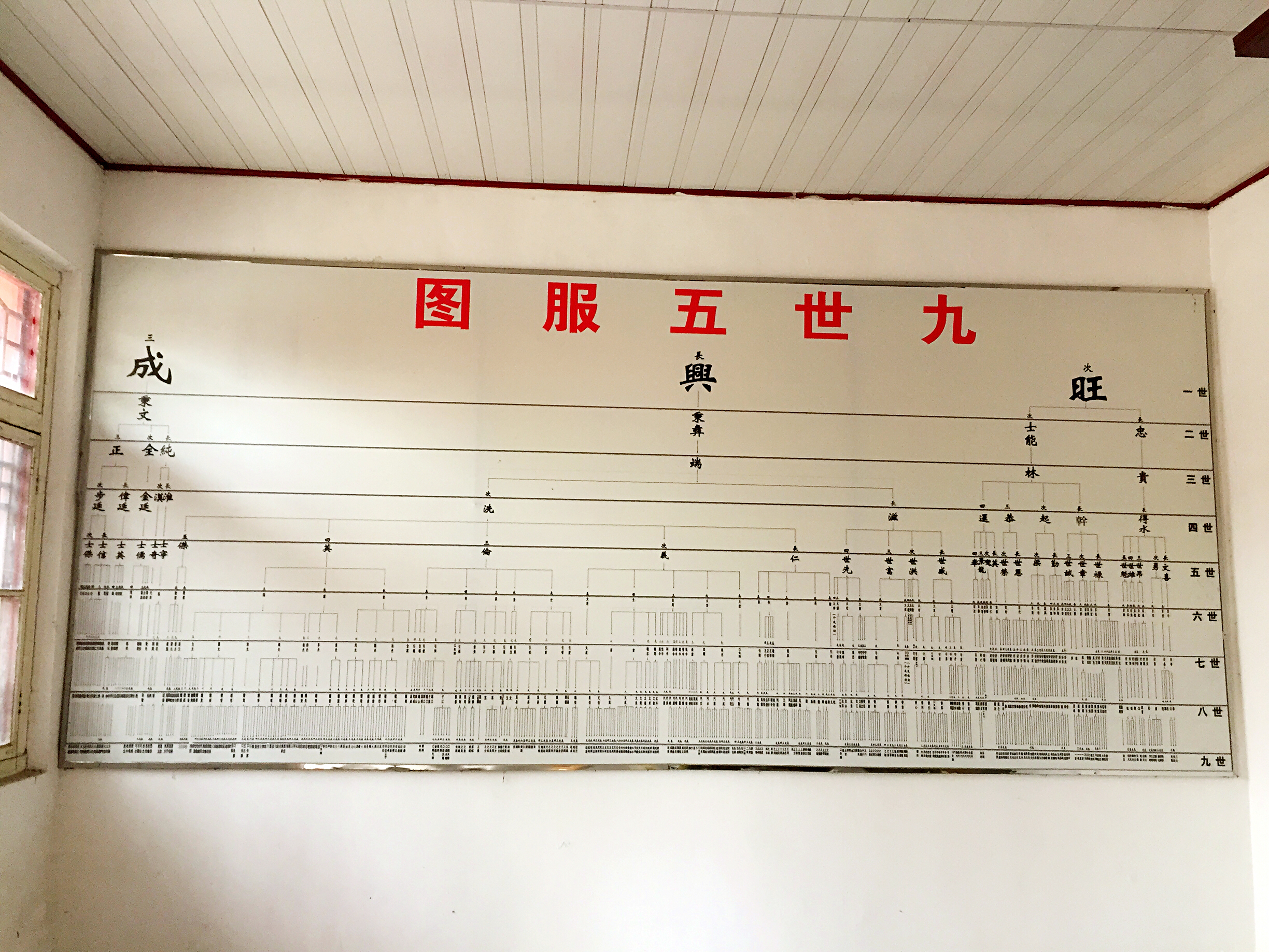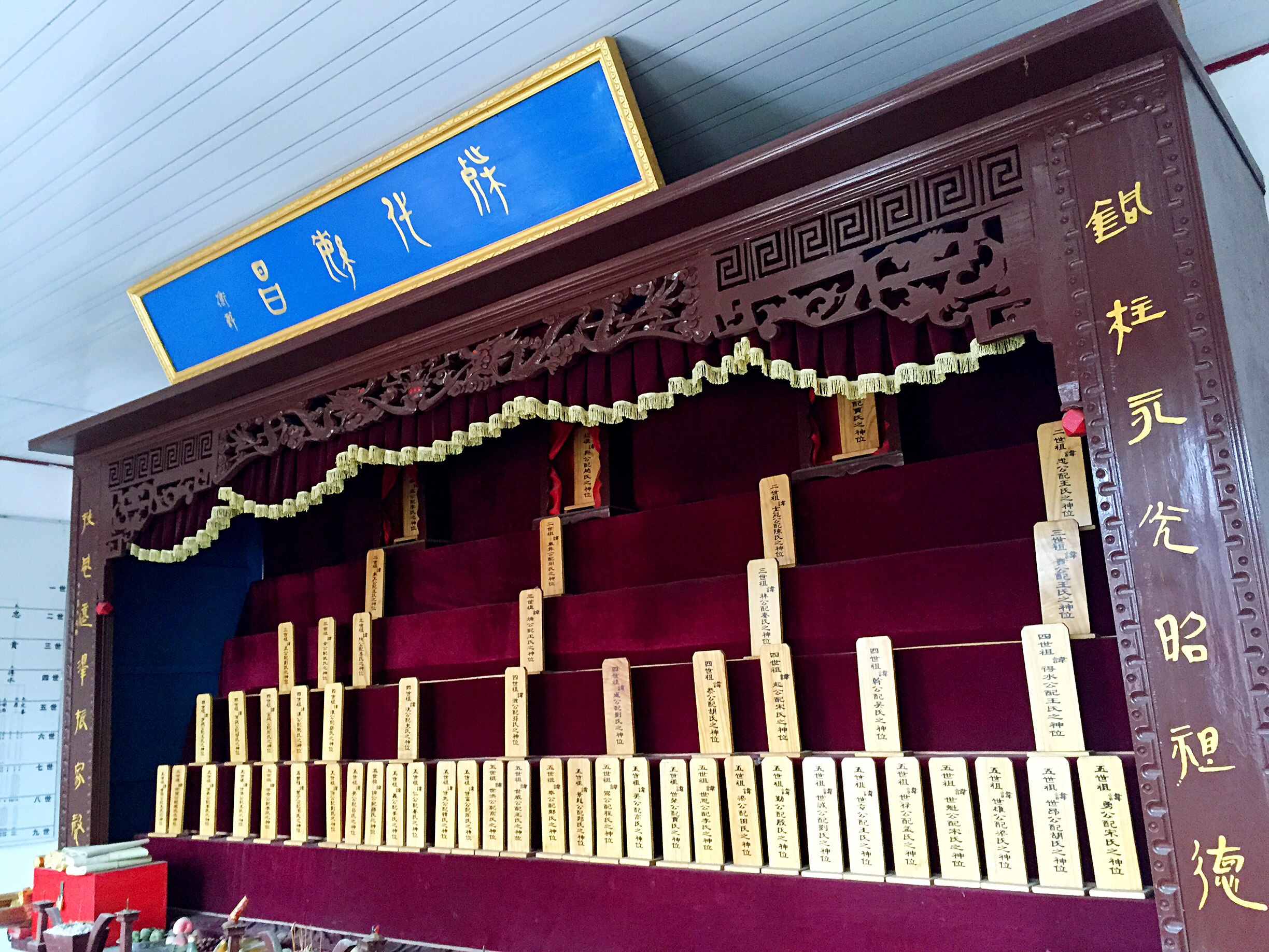 神龛,用实木雕刻而成。供奉着兴、旺、成及系下五世祖神位,供五十六位。神龛横匾“世代繁昌”和对联由马建钧题书。