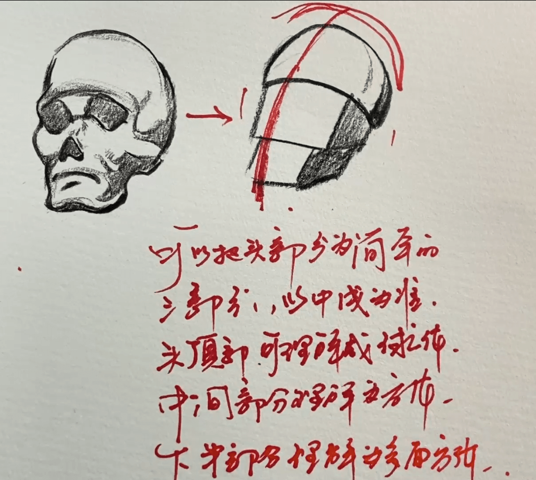这里能做的就是要理解和熟悉头部基本结构和形体关系,一般头部的形体可概括为一个方体或蛋球体,在表现是要把握它的动态透视,理解正面,侧面,顶面和底面的关系。