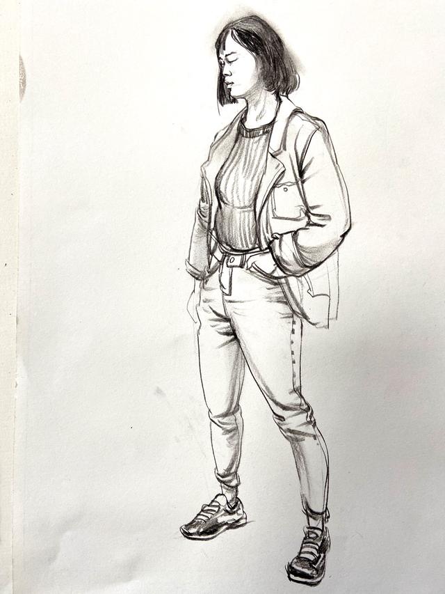 我们在画人物速写的时候,抓住人物头,手和参照物的微妙关系,才能画出生动有感觉的动态,注意用越简洁的线条来体现越生动的动态关系越好