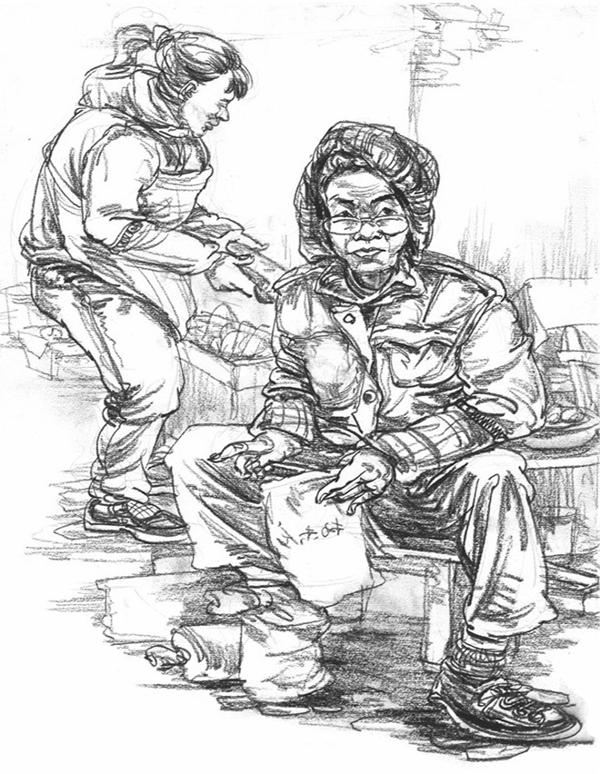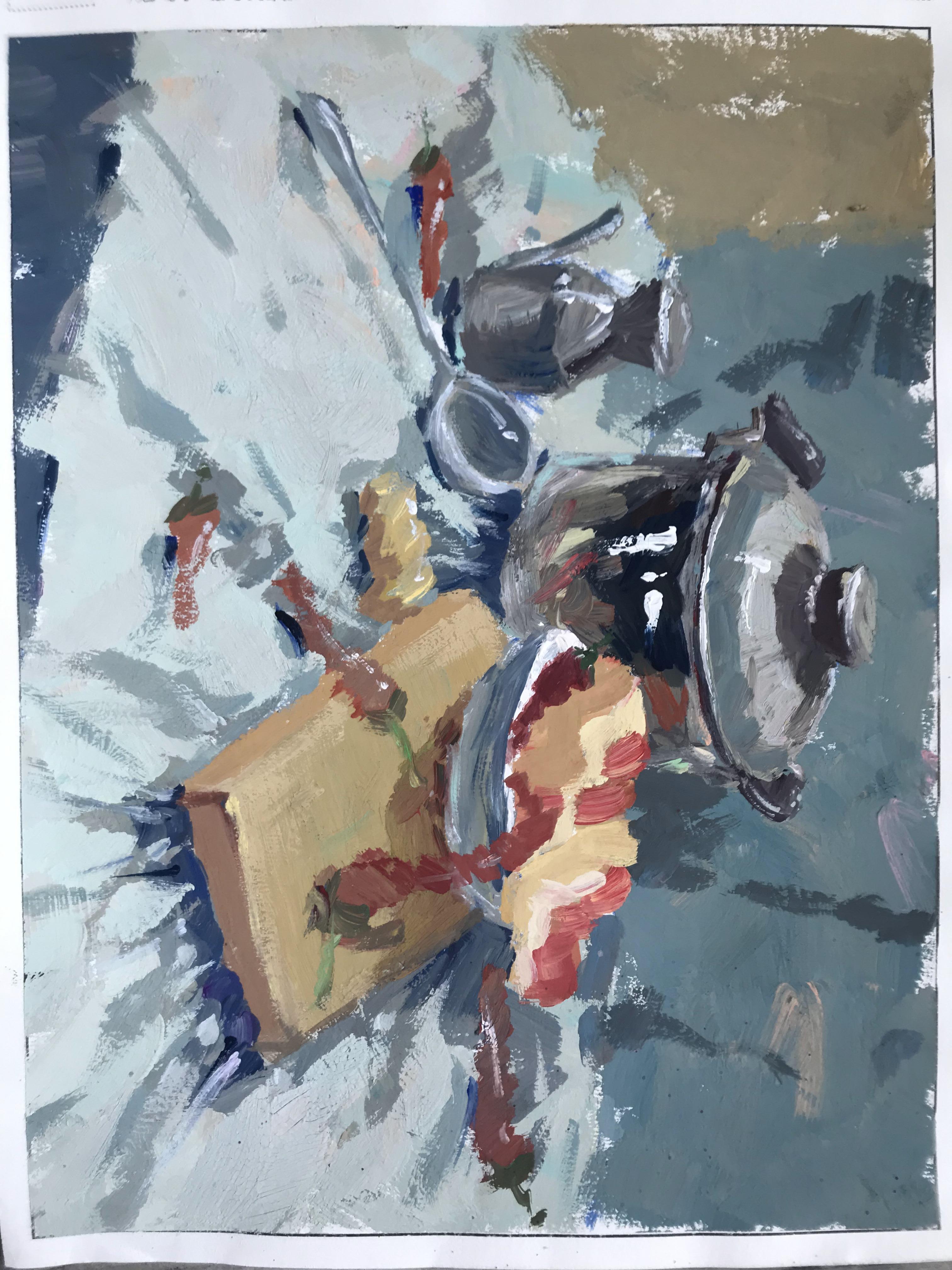 用笔要随着布褶的走向,或曲或直,布褶方向就是笔触方向。尽量用大笔来完成,注意大面积前后的冷暖关系和明度、纯度关系。学会组织布褶,疏密关系要用概括的形式来表达。