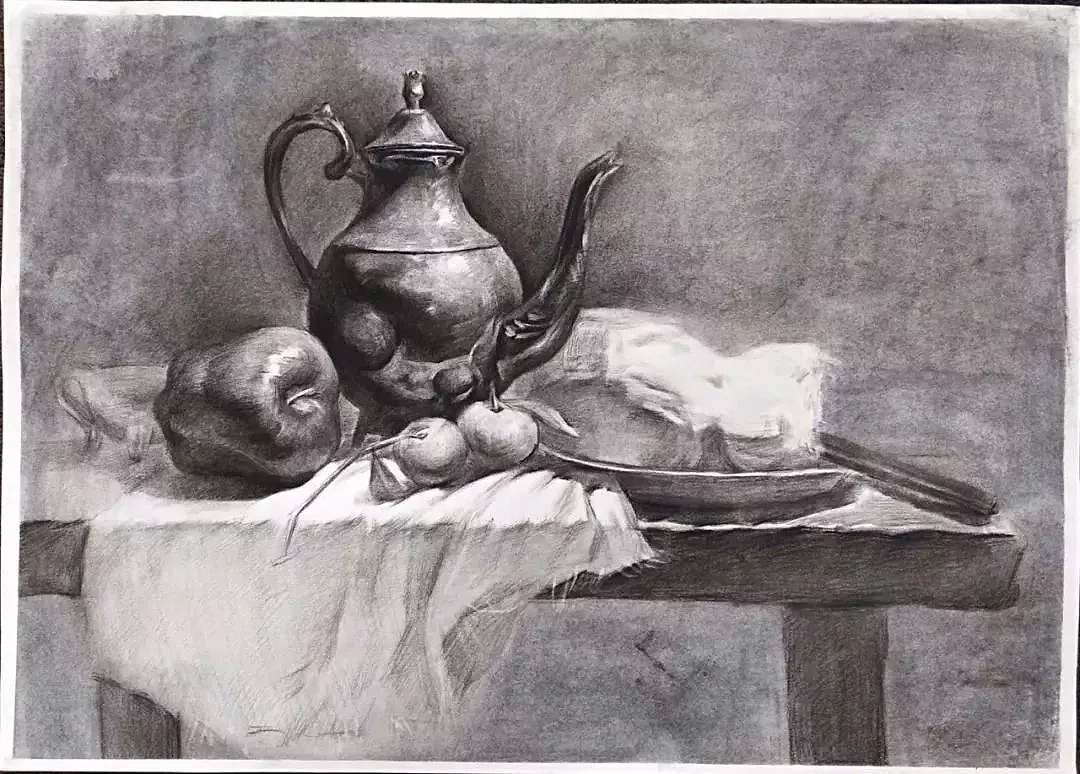 衬布是起衬托作用的,所以它的表达不能太突出,不能喧宾夺主,不然会画蛇添足了,只能概括性的表现它,还要考虑到它与主体物之间的关系(环境色、阴影等)。