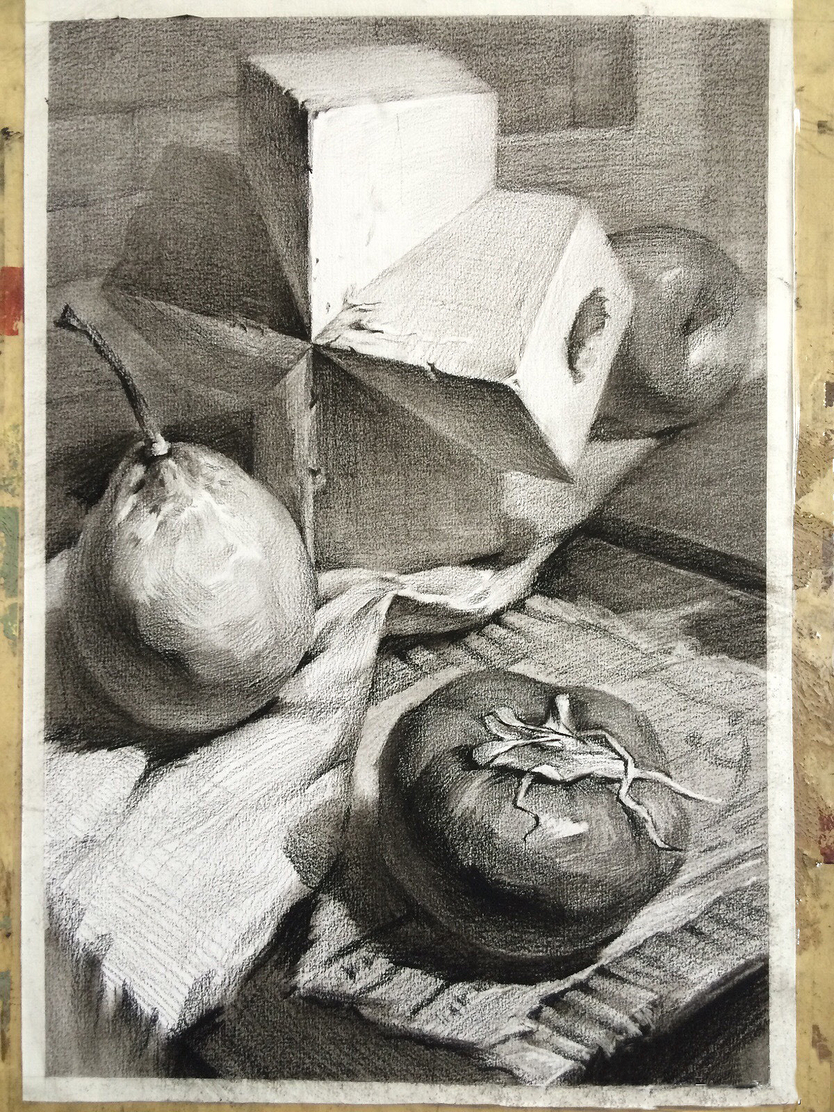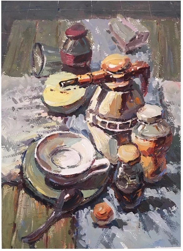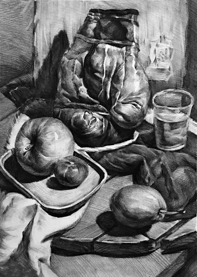 色彩倾向明确的衬布是确定整个画面色调的依据,同时衬布也是各静物间衔接的关键。一幅好的色彩静物,除了要将各静物表达到位以外,衬布的造型、颜色也是需要十分考究的。