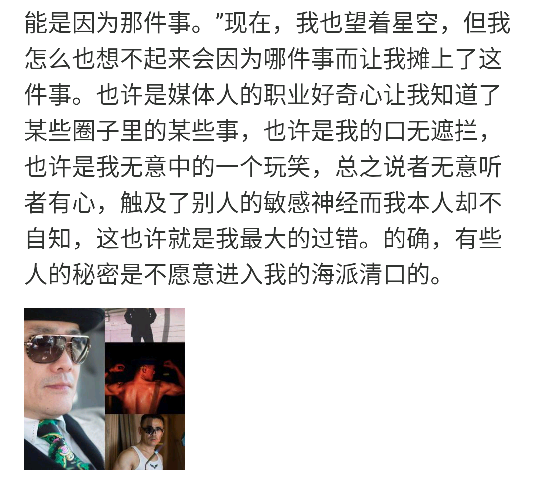 然而,此次美国的“涉毒持枪案”平稳度过,他性情似乎有些收敛,有“服软”倾向。发长微博“也许是媒体人的职业好奇心让我知道了某些圈子里的某些事,也许是我的口无遮拦,也许是我无意中的一个玩笑,总之说者无意听者有心,触及了别人的敏感神经而我本人却不自知,这也许就是我最大的过错。”