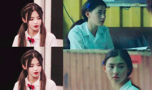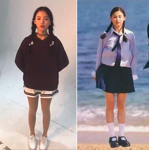 杨超越和张柏芝同扎双麻花辫的照片中,两人都配一条短裙,腿型也是十分的优美和相似。而同扎双麻花辫的情况下,无论是脸型还是气质也是颇为的相似。稍微有点区别的就是因为时代关系导致的像素问题使杨超越的五官更加清晰,但是实际上两者相差无几。