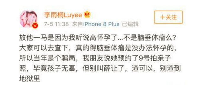 7月5日,李雨桐在絮絮叨叨爆料薛之谦太多秘密的之后,又一次公布了薛之谦老婆高磊鑫怀孕,在微博上,李雨桐淡淡的说了一段话,表示自己从此以后打算放薛之谦一马,主要是因为从朋友那里听说薛之谦的老婆怀孕了,而且已经在预定了拍亲子照。但是李雨桐同时喊话薛之谦,不要叫“薛让”,渣可以,但是不要渣到地狱里。