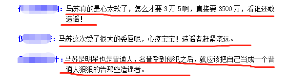 在声明和判决中,马苏要求造谣者连续7天发布道歉文章,并且是手写的,相信马苏也是希望通过这种手段让对方明白这种造谣是要付出一定的代价的。第二点是,马苏要求对方赔偿各种费用共计人民币3.5万元。对此,网友纷纷评价马苏这个人心太软,这么大的一个明星,仅仅是名誉损失费起码就要几百万的,3.5万对于那些造谣者来说就是隔靴搔痒,起不了什么震慑作用的。
