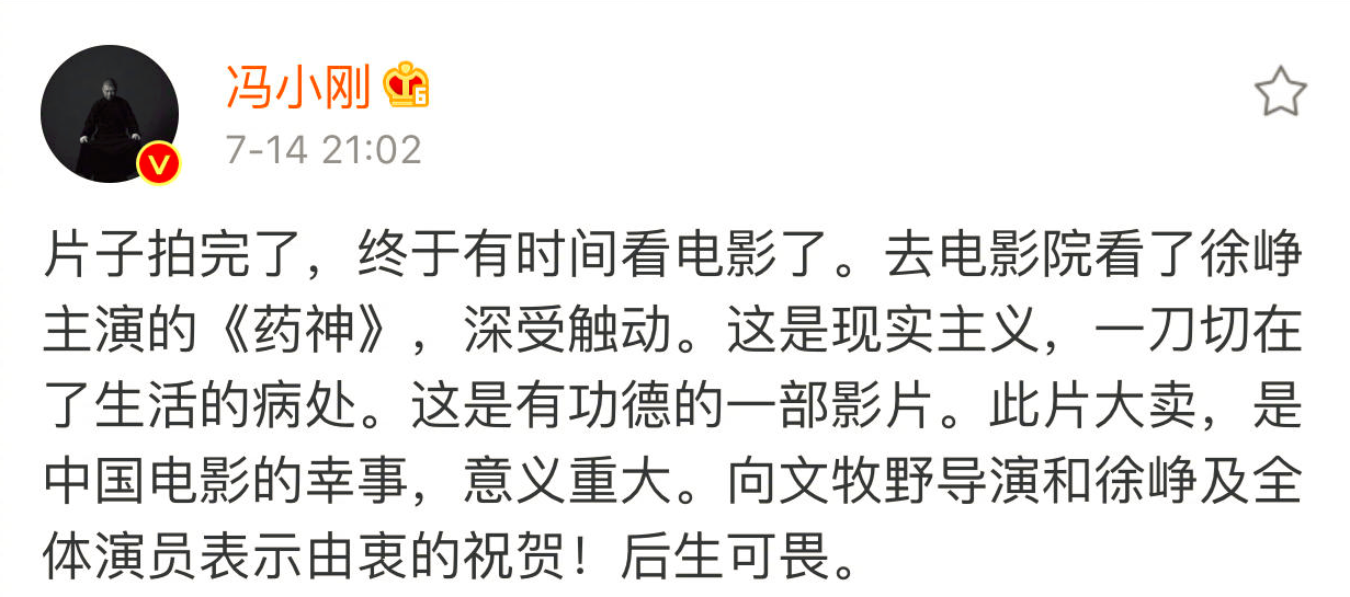 相信冯小刚对这部电影的评价应该是发自肺腑的,但是正在火气头上的网友们并没有因为冯小刚对“药神”的好评就对他宽容,而是反问冯大导演,作为一个新晋的导演,文牧野一举就打响了电影界如此重要的一炮,而冯小刚当了大半辈子导演,真正的给观众呈现出来多少有价值的作品呢?