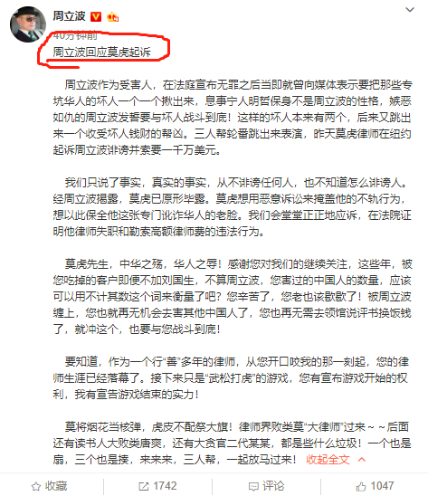 但是面对这样的起诉和网友的起哄,周立波并没有慌乱阵脚,7月16日中午发布一则名为“周立波回应莫虎起诉”的长微博,几百个字的回应,网友们纷纷竖起拇指赞叹这个回应真的是太有水平了。具体怎么个有水平呢?不妨展开分析一下。