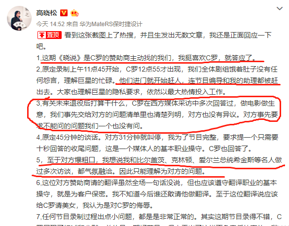 面对网上的指责,高晓松也不得不站出来发布声明,澄清了当时的情况,分别用7点说明了为什么请C罗,在访谈之前遇到什么情况,访谈的过程中又发生了什么状况。关于让C罗不爽的问题,高晓松是这样回答的:“有关未来退役后打算干什么,C罗在西方媒体采访中多次回答过,做电影做生意,我们事先交给对方的问题清单里也清楚列明,对方也没有异议。对方事先要求不能问的问题我们一个也没有问。”