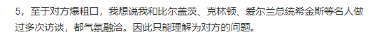 同时言下之意,也把“爆粗口”一事直接指向C罗,高晓松说:“至于对方爆粗口,我想说我和比尔盖茨、克林顿、爱尔兰总统希金斯等名人做过多次访谈,都气氛融洽。因此只能理解为对方的问题。”侧面说明了在采访C罗的过程中遇到的尴尬场面和自己没有关系,是C罗的问题。