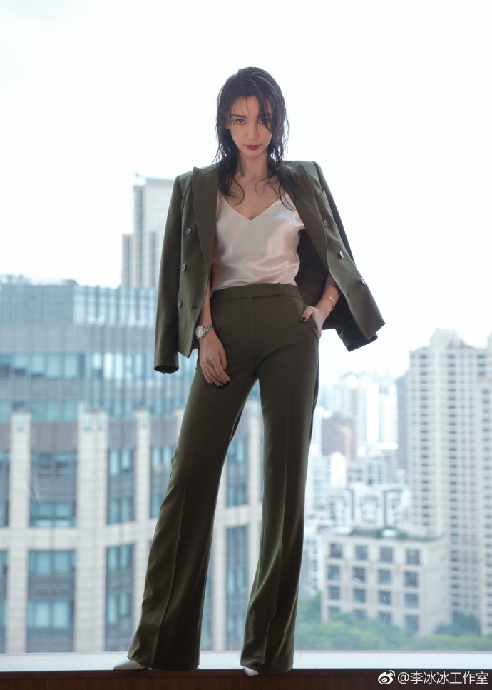 李冰冰上演的是性感冷艳风,灰绿色外衣,灰绿色宽松裤,加上白色内里,打扮十分前卫新潮。也将自己本身的轮廓勾勒的淋漓尽致。可以看到,这样的穿搭十分显腿长腰细,妥妥的男性的梦中情人。