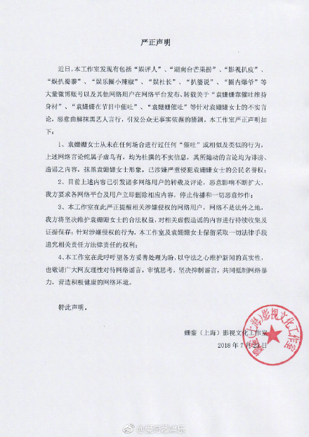 面对网上沸沸扬扬的“催吐”传言,不少人惊呼,经常黑袁姗姗的网友们这次要惹麻烦了。7月23日,袁姗姗工作室发声明辟谣并表示要以法律手段维护袁姗姗的权益,并呼吁广大网友理性对待网络谣言,共同抵制网络暴力。有网友为袁姗姗表示委屈:这样的谣言也能编出来。结果很多人又说:第一次听说为了保持身材“催吐”,还以为姗姗怀孕了呢,这些网友们脑洞还真的是特别的大呢。