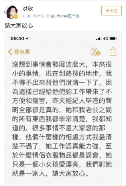 早在消息被爆出来之后,经纪人回应完,张丹峰的老婆洪欣就赶紧发表声明让大家放心,表示了自己对老公也是十分信任,并发表长文向网友解释老公和经纪人只是关系好而已,而且她自己也跟老公的经纪人关系很好,他俩都把经纪人当成小妹妹,所以行为上会比一般的人亲密点儿。