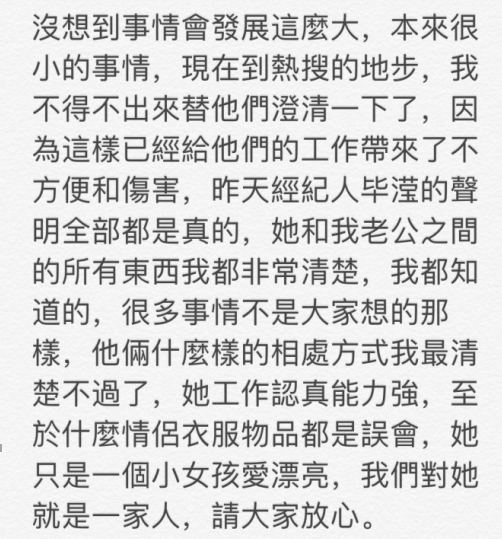 洪欣在给张丹峰购买东西的时候,也顺便会给经纪人毕滢买一份。在张丹峰的家人聚会中,毕滢也都是一直陪在身边,就像洪欣和毕滢的回应中,他们一家人都把经纪人当成自己的家人了,当成张丹峰的妹妹,所以不存在网上传言的出轨之类的说法。但是仍然有人将洪欣成为“女版王宝强”。