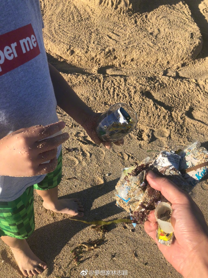 林志颖携kimi海滩捡拾垃圾,父子其乐无穷,网友:李湘脸红不?
