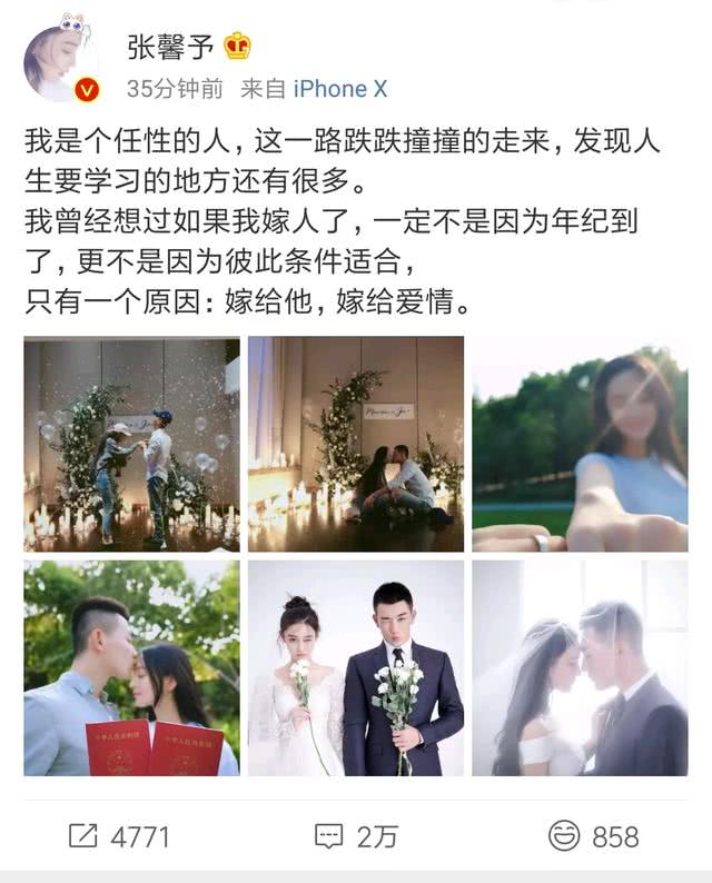 http://si1.go2yd.com/get-image/0PNH9OMntlg张馨予8月5日在微博高调地宣布结婚了,并大方地晒出自己的婚纱照、钻戒和结婚照,而且配文:“我是个任性的人,这一路跌跌撞撞的走来,发现人生要学习的地方还有很多。我曾经想过如果我嫁人了,一定不是因为年纪到了,更不是因为彼此条件适合,只有一个原因:嫁给他,嫁给爱情。”这样地真性情也是让网友一改往日对她的吐槽,大加赞赏。