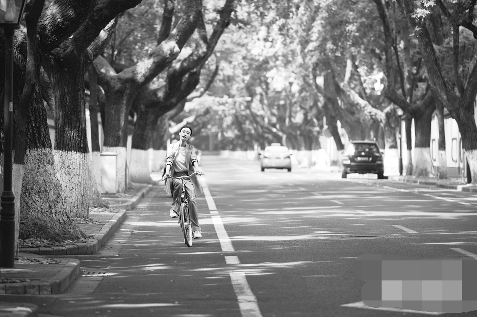 骑自行车,想必是大学时候最让人忽略却又最青春洋溢的事吧。倪妮的这次操作可以拿满分,青葱的树林,阳光的走道,一位骑车的小姑娘,配上黑白滤镜十分的有意境。而老式的自行车和旁边的现代汽车相呼应,更是蕴含了更加深层次的意境。