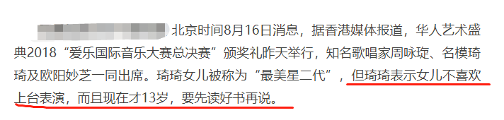 “星二代”这个词现在好像被好多人诟病,尤其是在某几个星二代的身上,算是把这个词彻底的“玩坏”了。但是不得不说,任晴佳确实算得上优秀。8月16日再次随着父母参加活动,就受到了很多媒体的追问。有记者问到如果任晴佳长大之后会不会进入娱乐圈,此时母亲琦琦说:暂时不会打算让她出道,没有心思想要进娱乐圈。这或许就是作为明星父母对孩子最好的保护了吧。并且看起来光鲜亮丽时刻都在聚光灯之下生活的明星,实际上并不是那么容易的,背后的很多事情也不是想象中的那么容易。