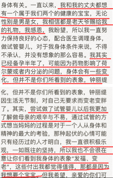 面对网上关于钟丽缇身材变形的话题,她自己也坐不住了。8月19日晚上,钟丽缇在社交平台上亲自发长文回应。说她和张硕轮一直都想要两个宝宝,所以在半年之前就开始备孕,但是药物的作用让身材开始变化,变胖,变老。而钟丽缇也坦言,对于这些变化和网上的评价,她自己不是很在意。