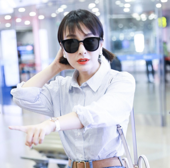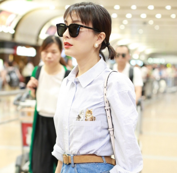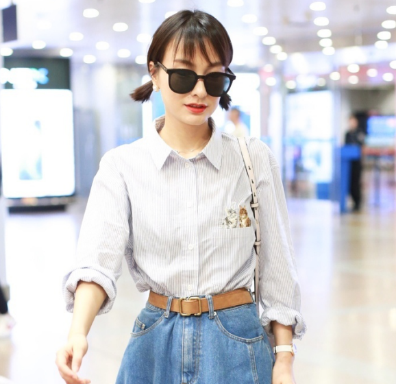 吴昕在机场的打扮,一改以往朴素的风格,走起了小清新的路线。身着韩版修身条纹印花衬衣,搭配的牛仔半身裙,中间再加上棕色裤带单品的点缀,整个造型看起来十分气质非凡,给人以清丽秀雅的感觉。牛仔与衬衣的搭配,本就是永不过时的经典,伴着时尚的英伦风,完美的诠释了灵动。