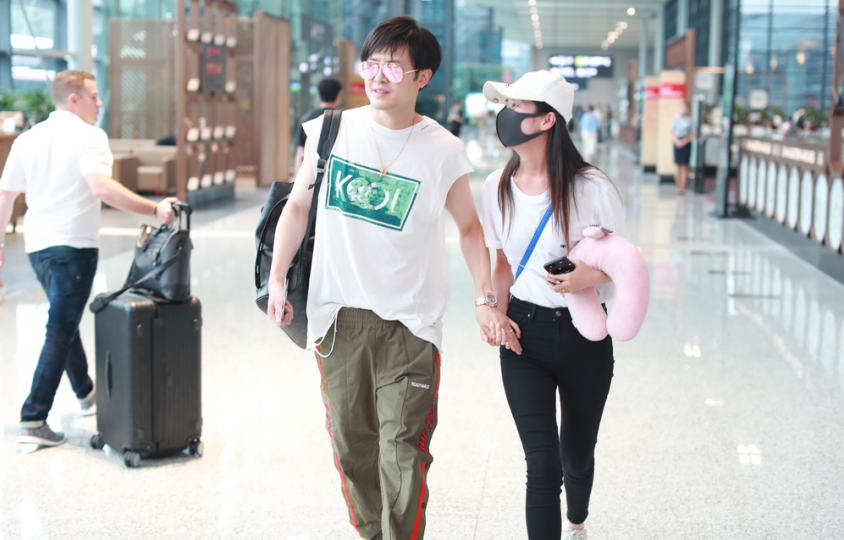 机场中付辛博上半身穿着灭世版网红GD权志龙的同款半袖,搭配上浅棕色的宽松条纹休闲裤,金链的点缀,整个造型简单霸气,男人味充分显露出来。浅红色墨镜单品的穿戴,显得十分新潮、酷炫。颖儿则身着朴素的白色半袖,淡雅的色系配上黑色紧身长裤,黑白格调的搭配,简简单单就已经很讨人喜欢。黑色口罩与白色帽子更加增加了一丝神秘感,手中的粉色玩偶让整体搭配看起来更加别致,提高着装品质感,衬托出无以伦比的典雅气质。