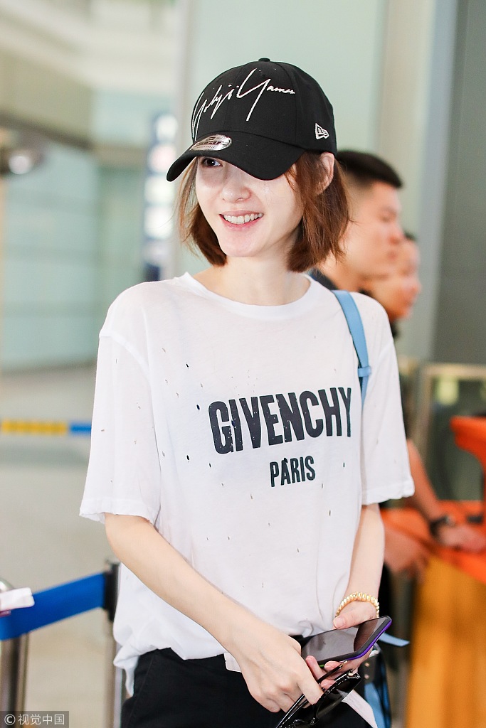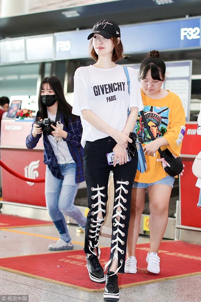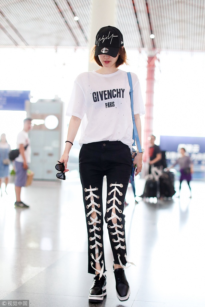 从网友爆出的照片看,机场的王丽坤头戴黑色棒球帽,素颜出镜的她看着肤色白皙,上身一件白色T恤,一条黑色裤子潮范儿十足。不过又眼尖的网友却发现王丽坤的这条裤子跟戚薇前几天的一条裤子很像,虽说同样是比较冷门的黑色,但是戚薇裤子上的带子确是黑色的,可能刚好是对应上面的白色T恤,时尚也不失可爱。从这身衣服看,王丽坤的搭配还是很大胆的。