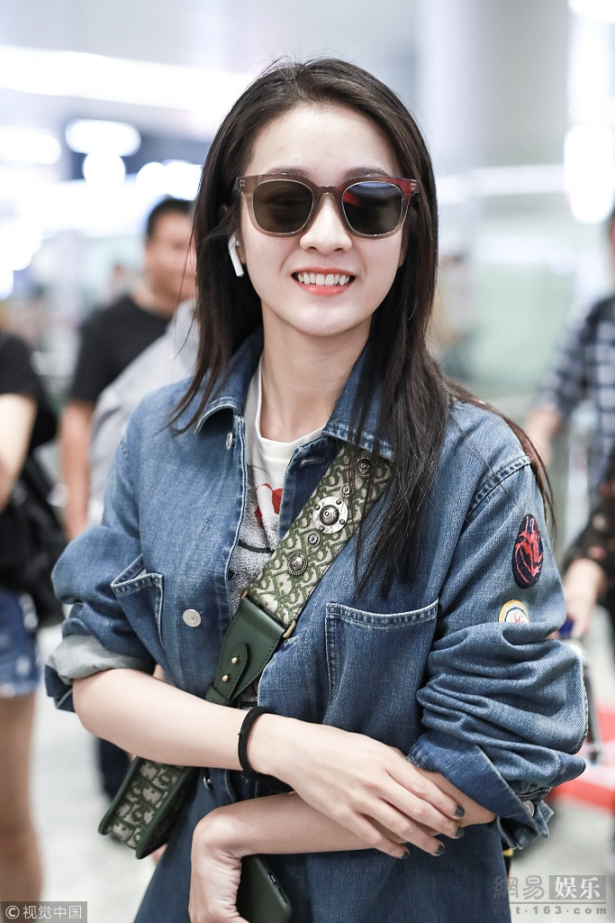 机场中的张雪迎,身着深蓝色的牛仔修身长衬衫,上面独特的图案设计更为此服饰增添了不一样的色彩,不规则的图案放置位置增加了服装的分量感。里面则是印有红白相间可爱卡通的白色T恤,打破了纯蓝搭配的沉闷,显得更加青春洋溢。浅绿色的具有复古风情的单肩背包单品的点缀,中性雅痞的搭配使得整体风格简约大方。浅红色墨镜的装饰,则增加了一丝神秘感,加上标志性的甜美笑容,突显出了无以伦比的典雅气质。