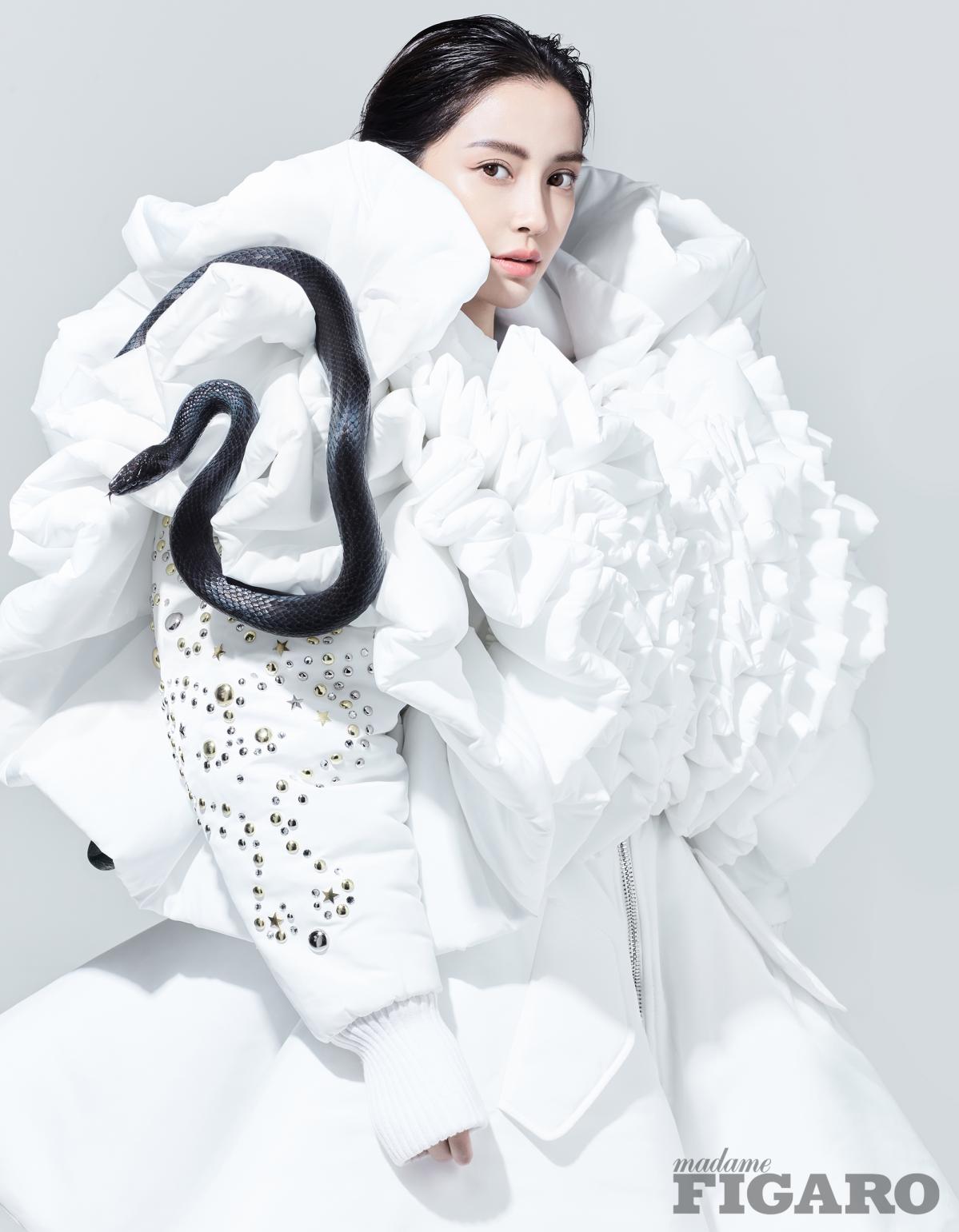 照片中的angelababy看上去不仅让人感觉面容美艳,而且造型百变,时尚感爆棚,分分钟体现出国际大片范儿。但再仔细一看,身上缠绕着一条活生生的蛇,看起来都让人觉得瘆得慌,但是Angelababy还是坦然自若的完成了这一组大片的拍摄。