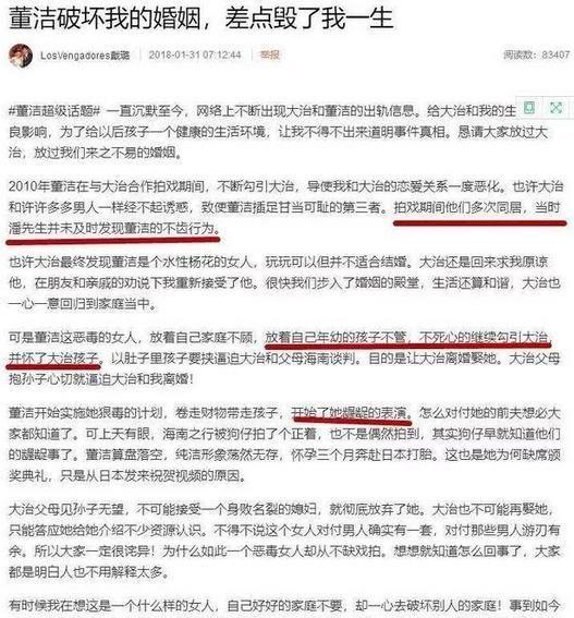 潘粤明与董洁刚刚离婚的时候,被网上不少网友骂道,据说当时董洁说离婚的原因是因为潘粤明粗暴无理、嗜赌、出轨导致潘粤明的人设崩塌。董洁也成为网友关注的焦点,网友纷纷表示心疼董洁。然而,没过多久网上关于董洁出轨的视频爆红网络,王大治的妻子更通过微博直指董洁婚内出轨王大治,董洁的清纯形象也因此荡然无存。