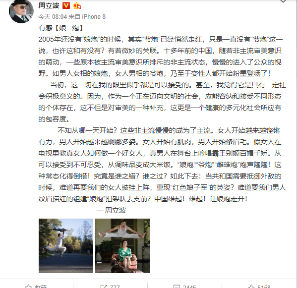 在长文的最后,周立波写到:“让娘炮走开”。对此,大家怎么觉得呢?一切都是正常的?还是确实不应该让这种现象过多的存在了?