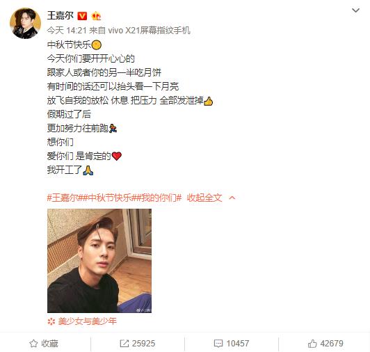 王嘉尔也不甘落后,,发出了一番自己的感慨,他说:“今天你们要开开心心的,跟家人或者你的另一半吃月饼,有时间的话还可以抬头看一下月亮,放飞自我的放松、休息、把压力、全部发泄掉。假期过了后,更加努力往前跑。想你们,爱你们 是肯定的。我开工了。“短短的几句话,充满了诗情画意。其实在很多粉丝的眼中,王嘉尔确实也是一个具有诗情画意的浪漫明星,但是没想到,在这样的节日中,他还需要继续工作,让人感慨,当一个明星也确实不容易的呢。