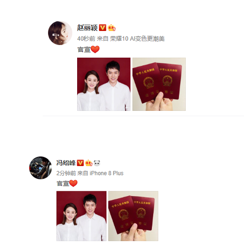 这次选择小颖生日和冯绍峰生日的时间发布结婚证照片,也足以见得两个人这卡点秀恩爱的方式有多么甜蜜了,更有粉丝留言称:好幸福啊!赵丽颖能嫁给冯绍峰不得不说还是很幸运的。两个人本身身份差距比较大,赵丽颖出生农村,而冯绍峰据说家族企业很大。不管怎样两个人能走到一起,还是很值得大家祝福的。你们说是吗?