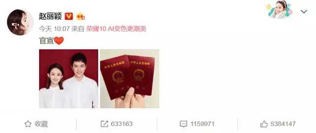 10月16日早上赵丽颖和冯绍峰几乎同时宣布结婚,并公开结婚证,而那天刚好是赵丽颖三十一岁的生日,两人真是甜甜蜜蜜,而冯绍峰更是直接称呼赵丽颖为老婆,并为赵丽颖送上生日祝福。