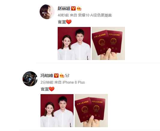 今年31岁的赵丽颖在生日这一天除了约了好闺蜜张碧晨一起过,还在这一天与男友冯绍峰领证了。赵丽颖在朋友圈除了晒出自己官宣的结婚证照片,还晒出与老公冯绍峰的合影,照片中赵丽颖搂着冯绍峰的脖子更留言称“谢谢我的他”,而照片中桌子上还放着一盒粉色和一盒红色的永生花。