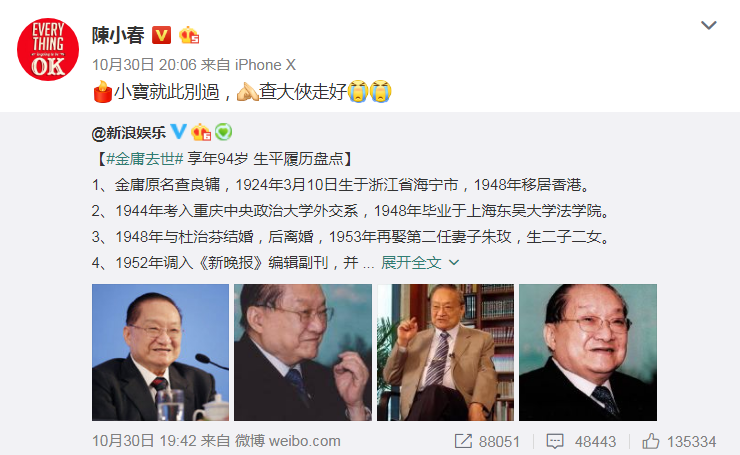这次老先生的逝世,不少社会各界人士纷纷发文表示哀悼,而对于曾经参与过金庸作品翻拍过影视剧的演员来说都在第一时间里通过微博写下送别老先生的话,尤其是参与过《神雕侠侣》和《天龙八部》《笑傲江湖》的明星。