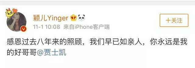 11月1日,颖儿一大早在微博上发出了这样一句话,“感恩过去八年的照顾,我们早如亲人,你永远是我的好哥哥。”并艾特了她的经纪人贾士凯。大家这才明白,原来颖儿与陪伴了她8年的贾士凯以及悦凯娱乐解约了。